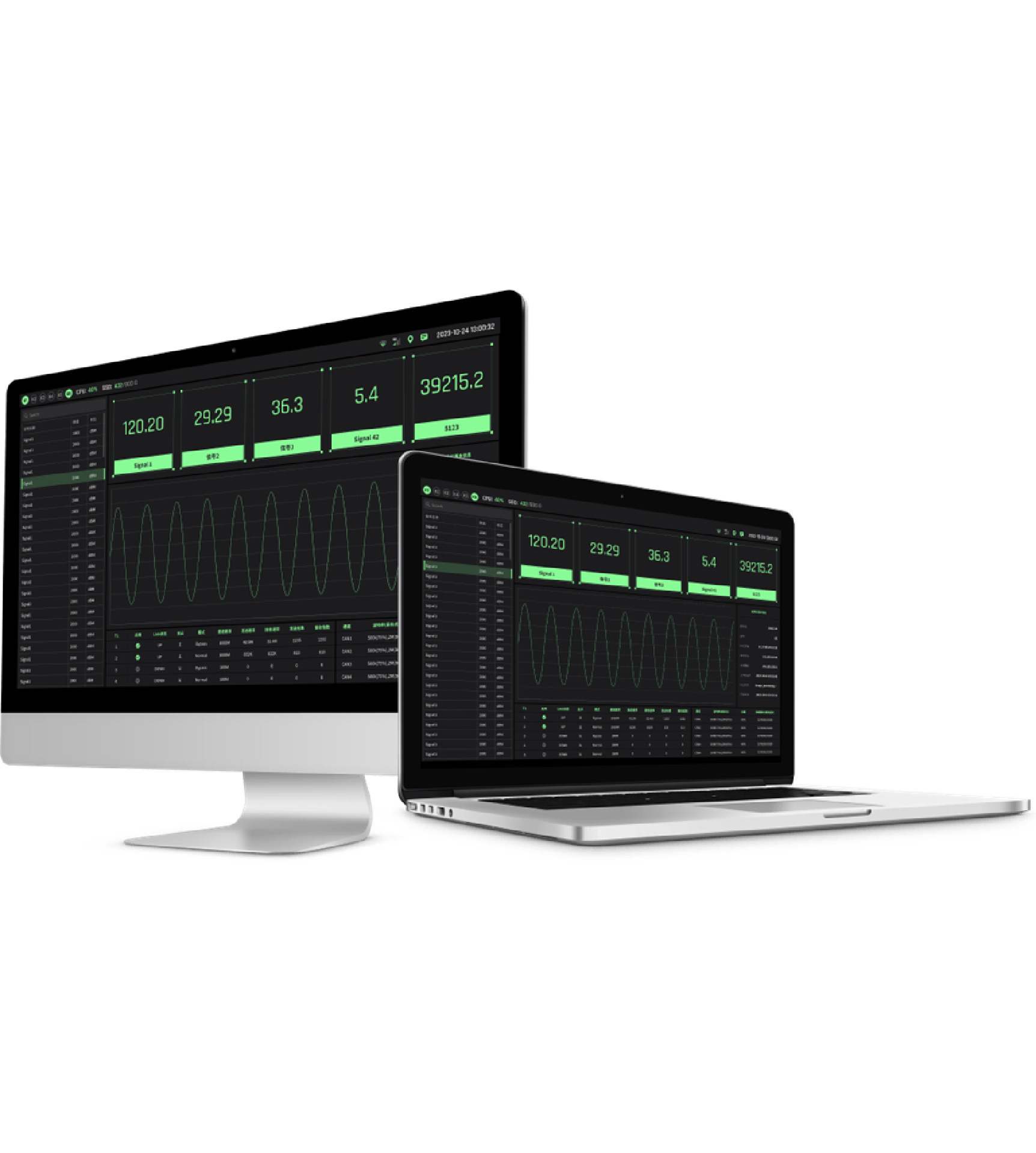 The platform delivers sophisticated data visualization capabilities including oscilloscopes, tables, digital dashboards, buttons, and RF icons.