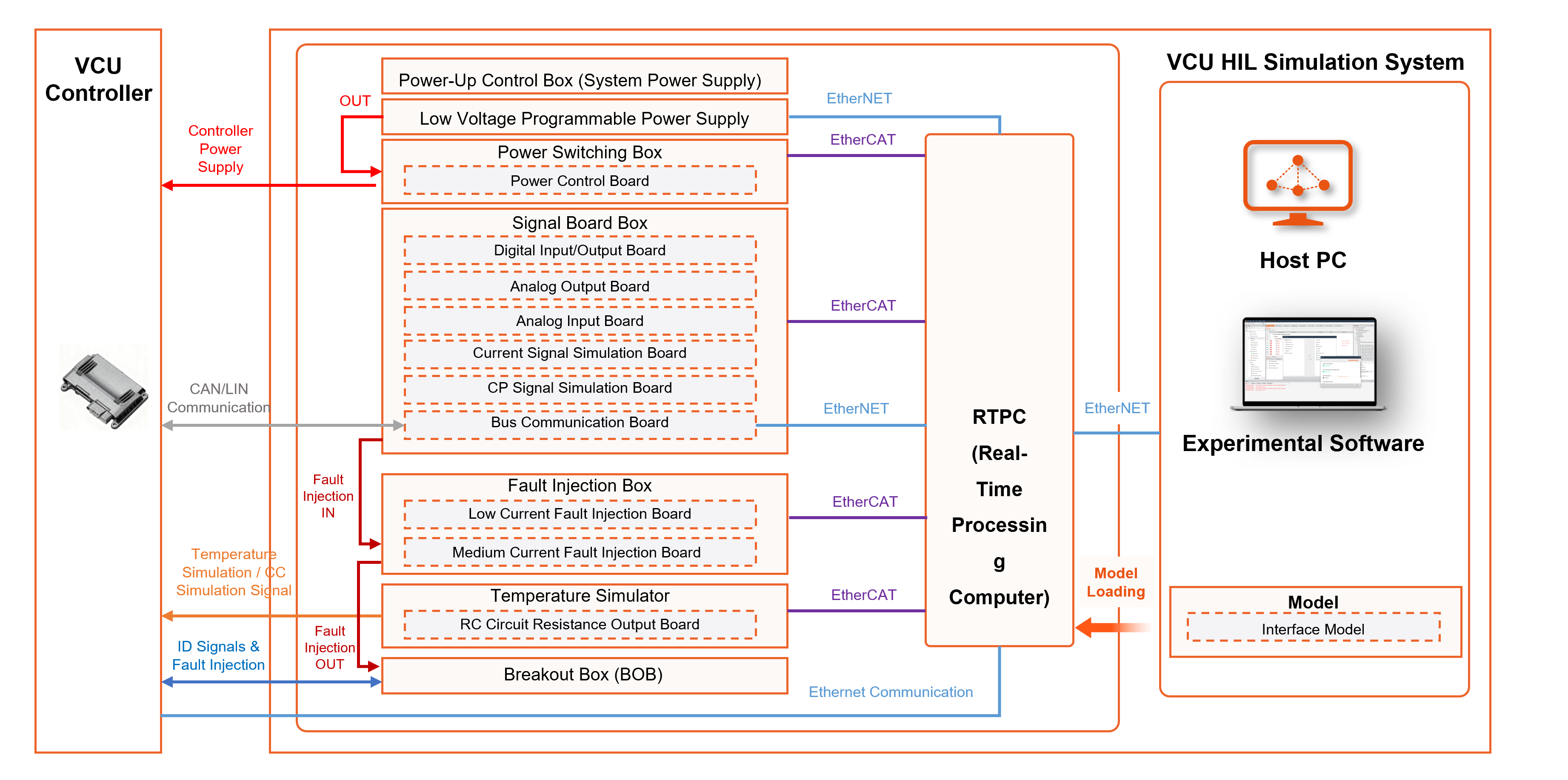 The Vehicle Control Unit (VCU) of new energy vehicles is the core control component, and the VCU control technology directly impacts the vehicle's performance, safety, and efficiency. The VCU HIL (Hardware-in-the-Loop) simulation testing system performs excitation tests, functional tests, fault reproduction, and extreme condition testing on the tested components, assisting developers in comprehensive and in-depth analysis and verification, ensuring the reliability of the component's functionality.