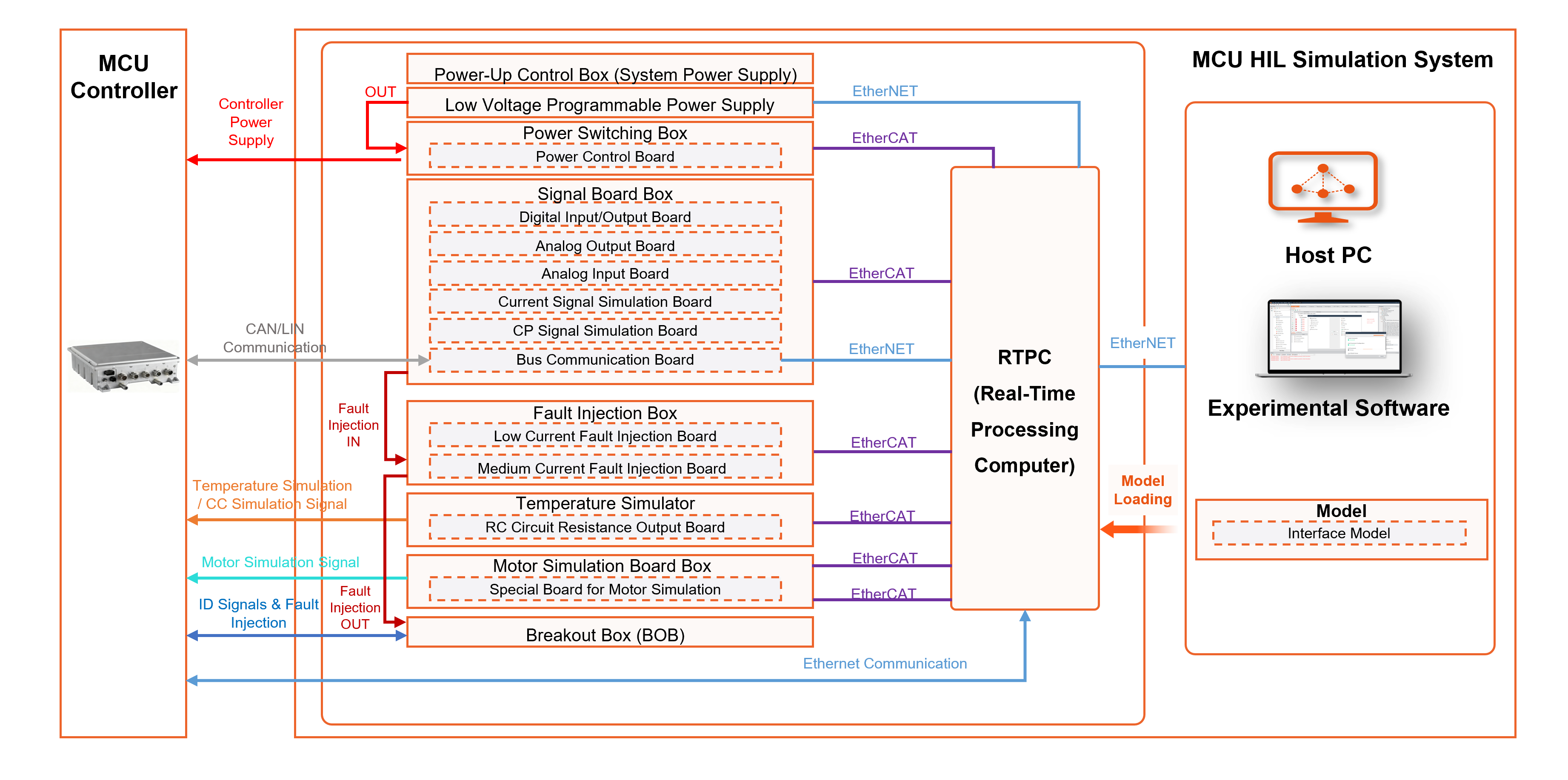 The MCU HIL simulation testing system includes core components such as a real-time host, FPGA motor simulation board, and CAN communication board. Through the host computer, the motor model is downloaded to the FPGA, enabling direct data output. The system supports closed-loop control, facilitates data interaction via the CAN card, and uses test management software and automation testing software to perform testing, fault injection, and test case editing, providing comprehensive verification of MCU performance.