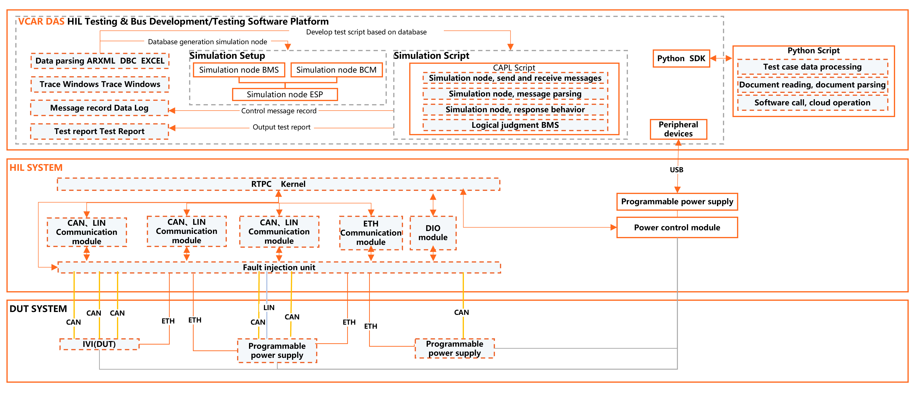 VCAR DAS combines automotive bus simulation, analysis, testing, diagnosis, database editing, calibration testing, and radar, video, and GPS data monitoring. It supports CAPL scripts and Automotive Ethernet communication protocol, featuring node simulation, diagnostic flashing, database editing, and parsing. Additionally, it facilitates automated development testing and is applicable in various scenarios like network development, simulation, testing, calibration and measurement, ECU/Vehicle development, and diagnostics flashing.